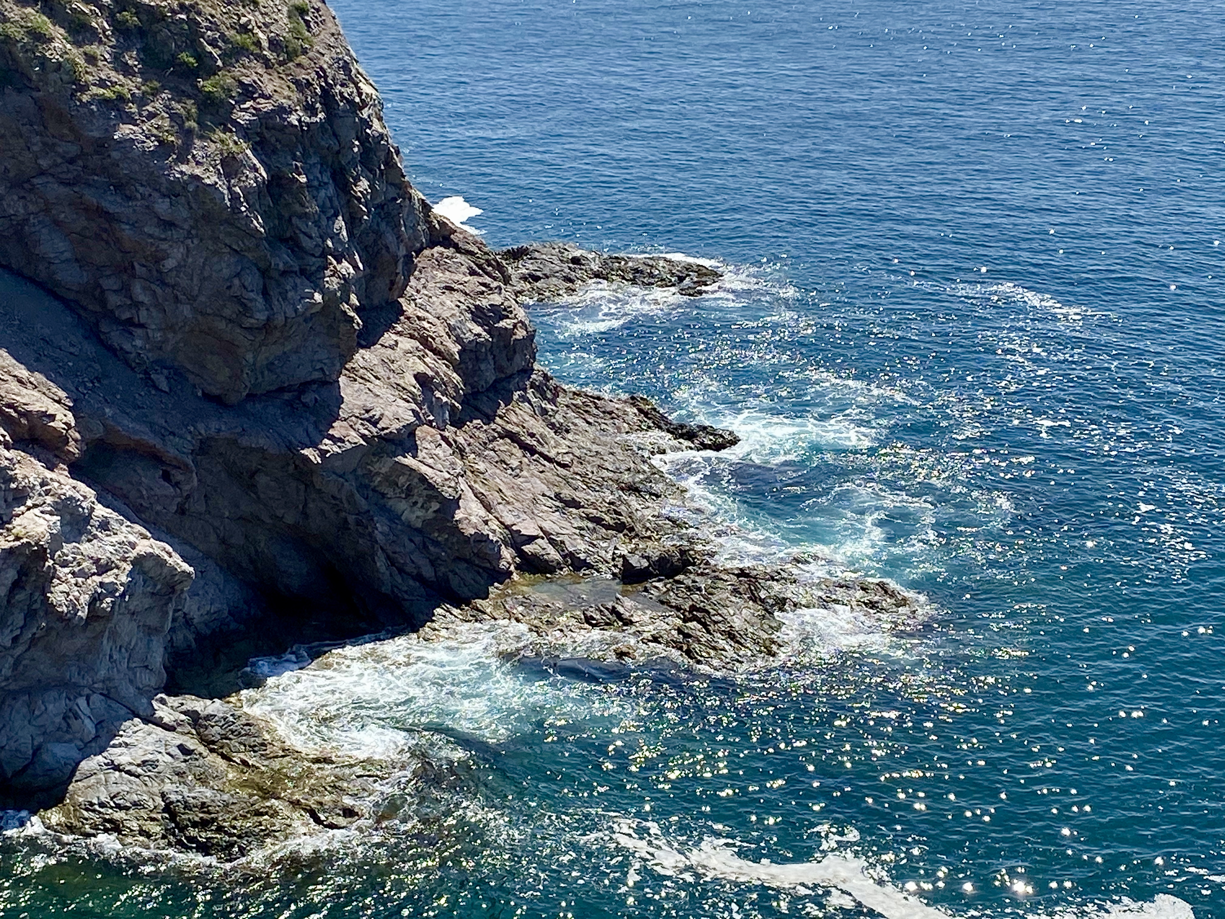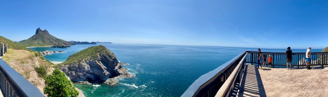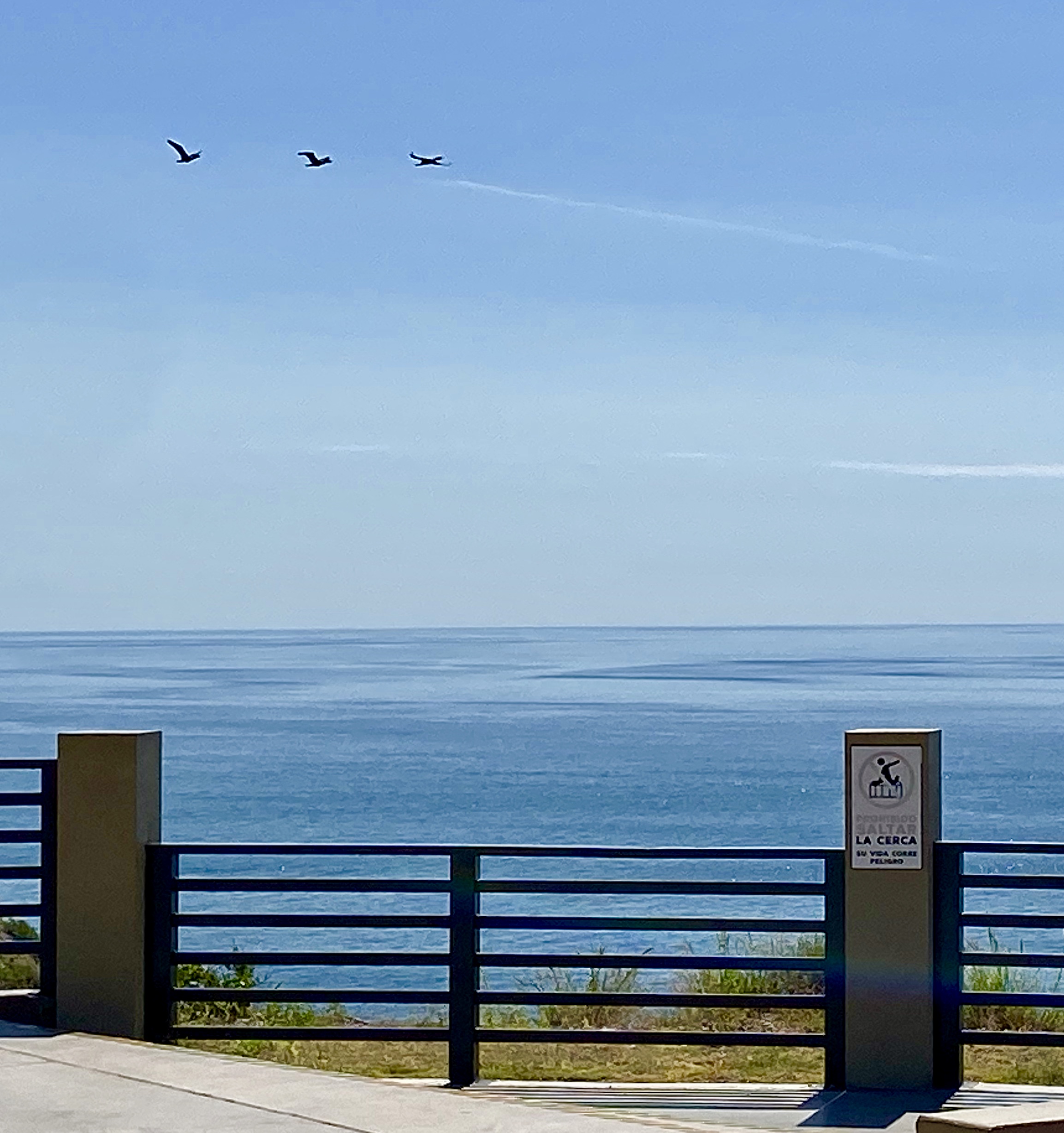 Strolling further down the railing you are transformed by the crystal clear waters crashing on the ruggedly fascinating coastline.  The rocky coast provides irregular levels causing the turquoise sea to create a frothy like appearance with each arriving wave. The outlook ends in a triangular point that appears to levitate out over the water.  This gives visitors a beautiful, unobstructed view of the expanded shoreline of San Carlos. It feels like a moving picture as birds float by at eye level and boats skim the water’s surface noiselessly beneath. From sunrise to sunset the dramatic land and seascapes are constantly altered.