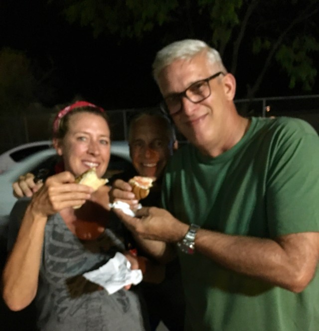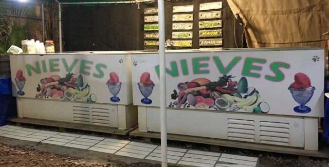 We followed our dog dinner with a visit to another multi-generational, family owned business in the form of a Nieves stand. This ice cream like dessert originates from the Mexican state of Oaxaca (pronounced Wa Ha Ka). It comes in both a water or milk base and has the consistency of snow ice cream that I made as a child. The sweet flavors are created from fresh fruits and natural ingredients. They range from dragon fruit (pitahaya) to Mexican vanilla (vainilla) and caramel (carmelo) to coconut (coco). There was even a tequila flavor. That evening fifteen options were offered. Our group made our selections and then settled into the plastic chairs under one of the 3 umbrellaed tables. The family dog snoozed on the ground nearby and the 5 year old grandson relished in his opportunity to clean the tables. We all agreed that his diligent efforts could only mean the tables at the stand were undoubtedly the cleanest in the state of Sonora. The nieves was filled with delicious, icy goodness and thus a perfect ending to the meal. Our friend, Steve, stealthily snuck the 125 pesos into the palm of the owner while we were enjoying casual conversation in the calm setting.