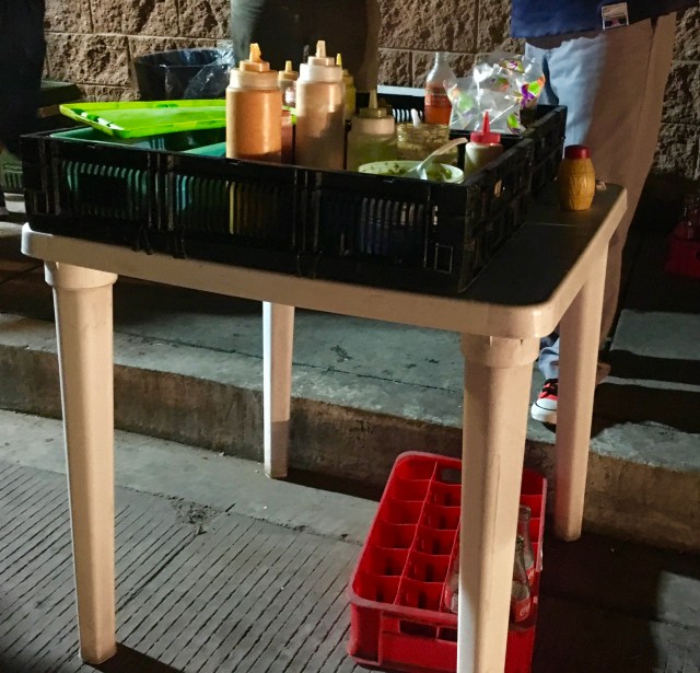 We arrived at a brightly lit street corner which was the “restaurant”. Steam was rising from a small silver cart and a delicious aroma filled the air. The long line led to three men working in tandem at an unbelievable pace. This was the family owned Los Pajaritos aka The Little Birds. The stand opens nightly at 6 pm and operates until they run out of hot dogs. And, they always do. Standing in line I mentally practiced the sentence I needed to be able to order my dinner. I was simultaneously wondering why I was even contemplating eating a hot dog. It’s been years since I’ve had one, I don’t actually like them and even though I’d learned that the sausages at Los Pajaritos were made of turkey, I did not dare let the processing creep into my brain. It’s my turn. The vendor picked up a napkin and grabbed a steamed bun that looked more like a small loaf of bread while using tongs points to the two dog options. I blurt, “Tocino.” Spanish hot dog stand lingo for I’ll take the one wrapped in bacon. Next he began pointing to the many condiments spread out before him. Grilled onions, raw onions, tomatoes, and chopped peppers. I can’t even speak, I just shake my head like one of those bobblehead dashboard dogs agreeing to everything. Now for the chili sauce, mustard and something that looked creamy. The vendor picked up each bottle and barked, “¿Uno, dos, tres? This was his way of asking how many lines of each would I like. I uttered some numbers and he thrust the dog in my hands. And just like that, he moved on to the next customer. I walked away with my hot dog toward the seating area which consisted of four plastic chairs placed neatly along the sidewalk. It’s crowded tonight and there were no seats available for our party of five. I passed a small table housing extra condiments and napkins and then to a cooler filled with a variety of iced down glass bottled Mexican sodas. I grabbed a soda and popped the top with the opener attached to the stand.