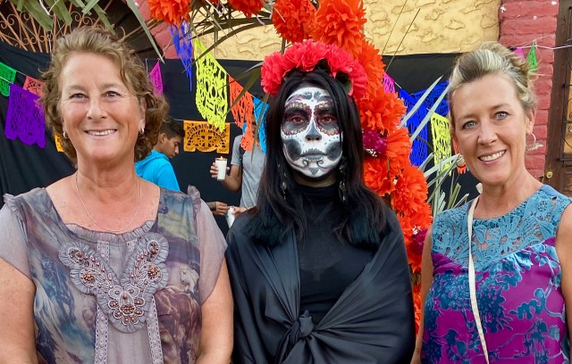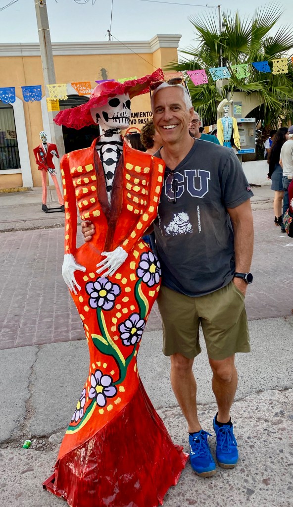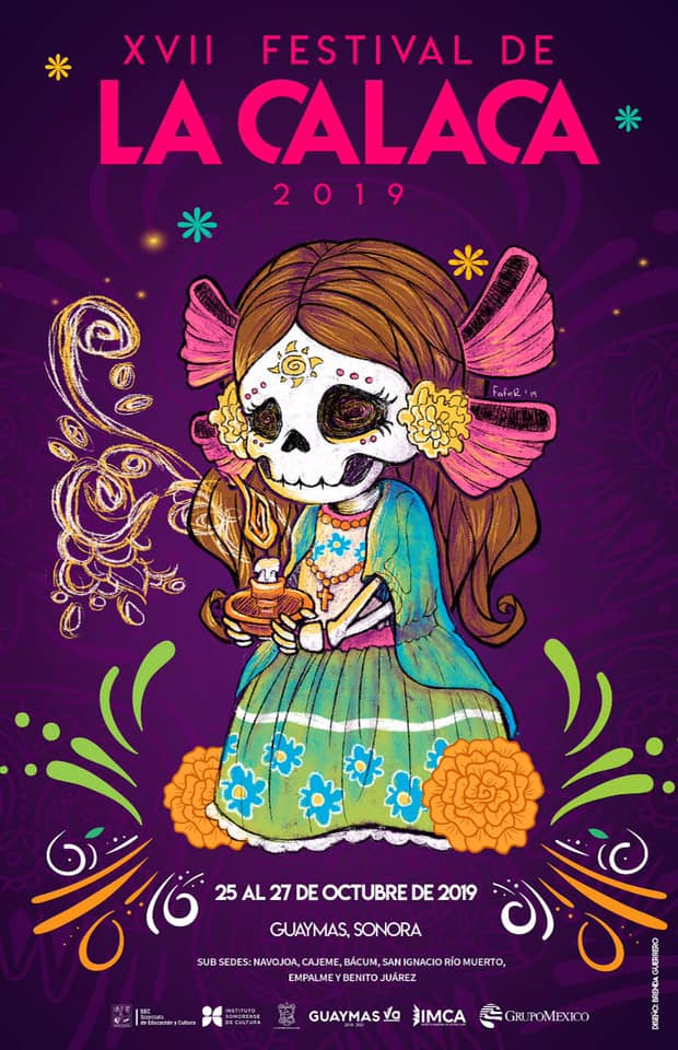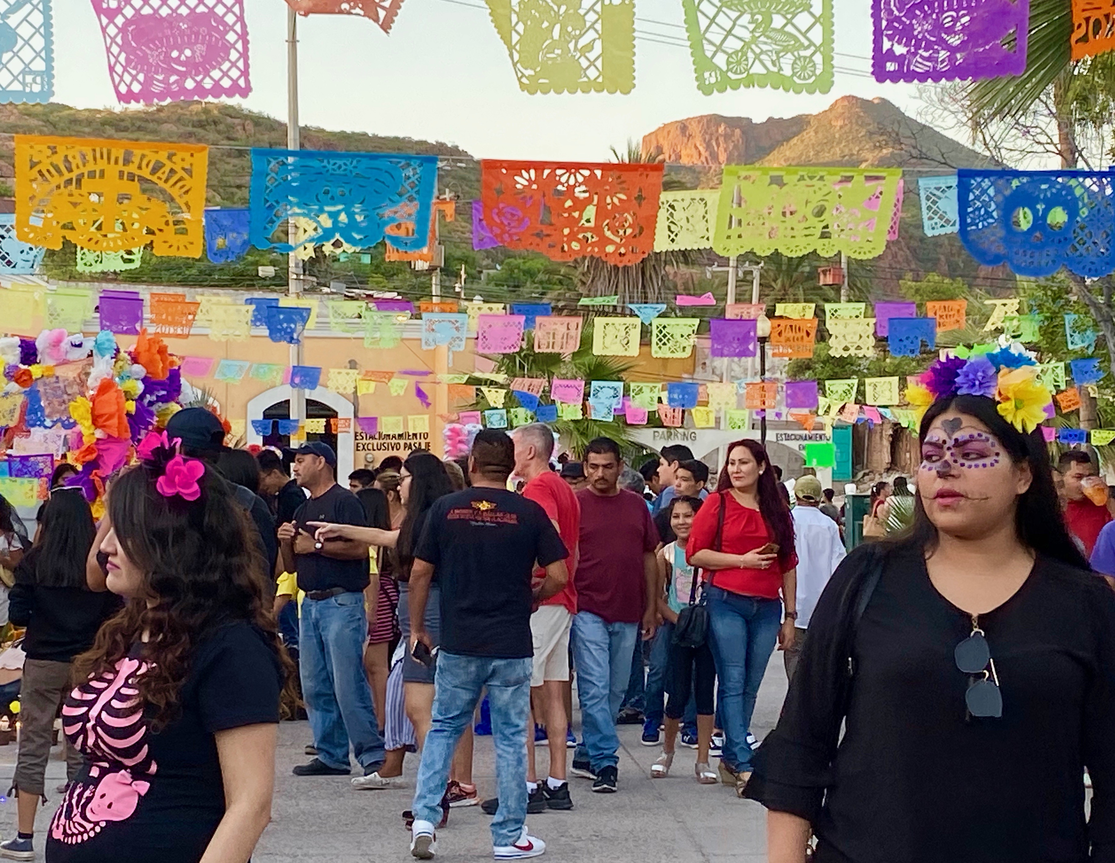 The last weekend in October the City of Guaymas held a three day cultural event, Festival de la Calaca, Festival of the Skeleton. The timing of the affair is based on it being the weekend prior to the celebration of Dia de Muertos or Day of the Dead. Festival de la Calaca kicked off with a mayoral ribbon cutting ceremony and parade. Each of the three nights, local school groups, dancers, bands and organizations strutted their stuff down the main drag in a procession that brought in big crowds. We arrived 45 minutes early to grab our piece of the curb. After much anticipation we witnessed baton twirlers, horn blowers, mexican dancers, garbage can drummers, people balancing water glasses on their heads and cute kids dressed in authentic costume shuffle down the street for the 15 minute parade. While it was short and sweet, the troops marching by were excited to have an enthusiastic crowd.