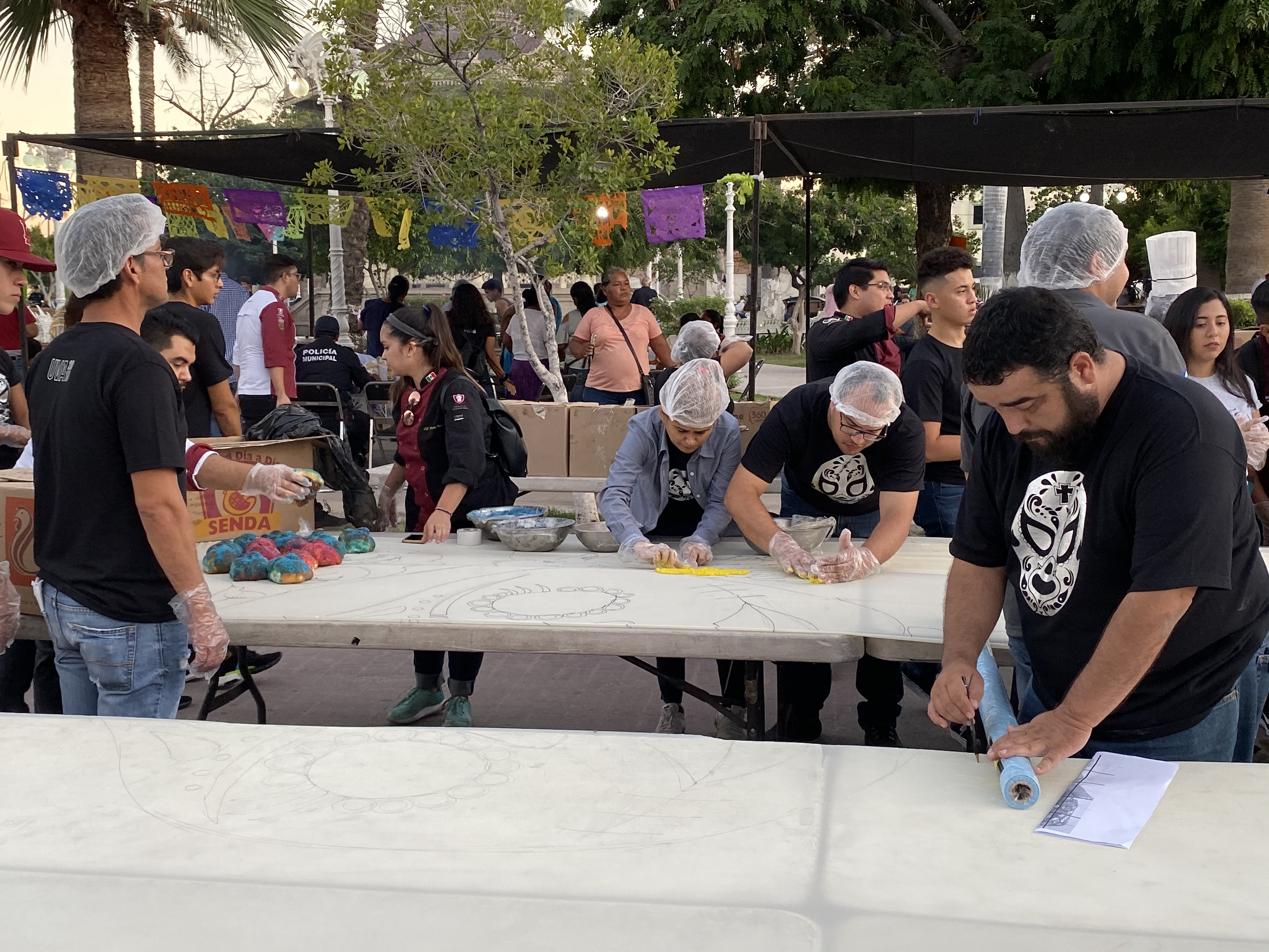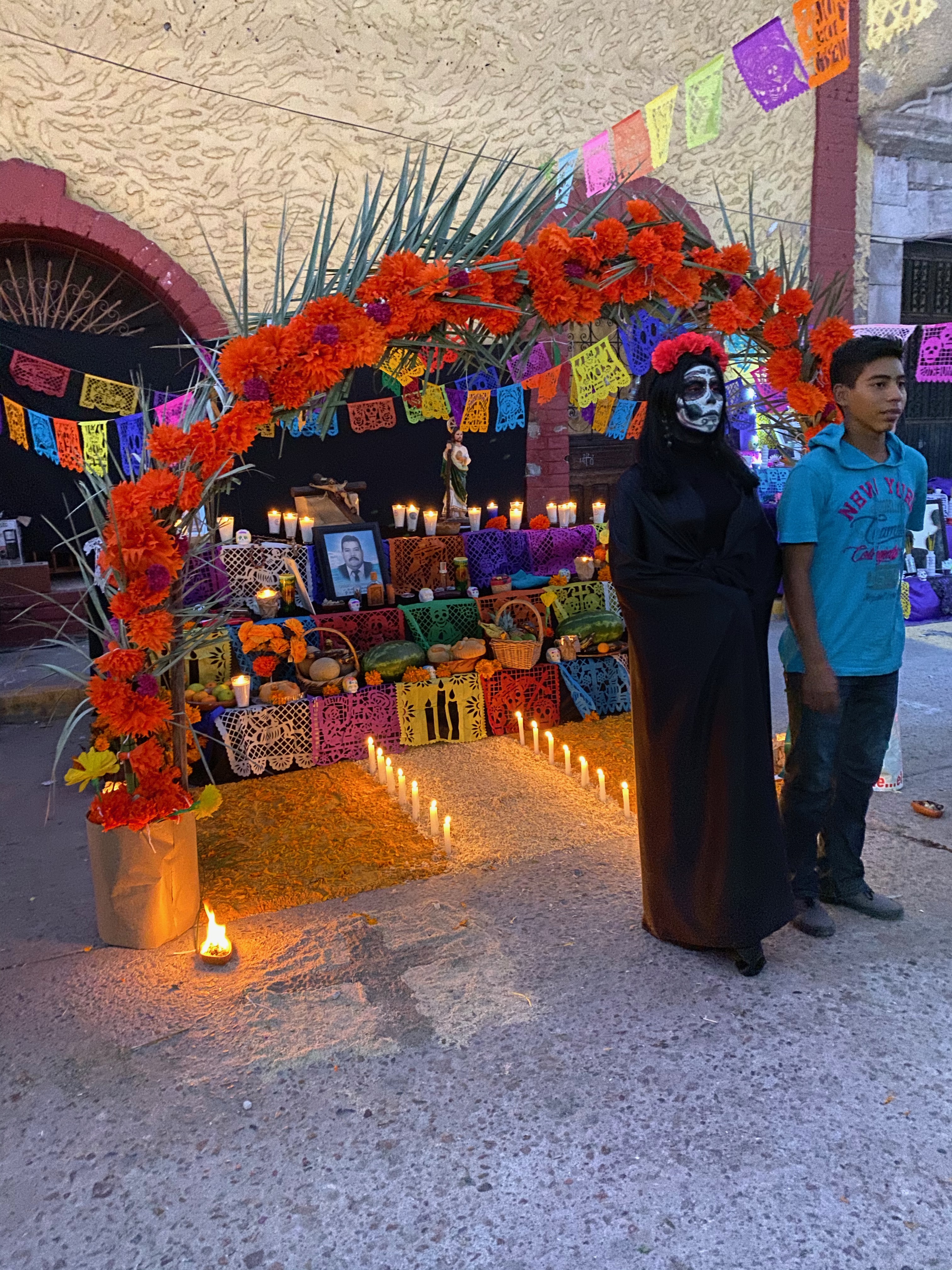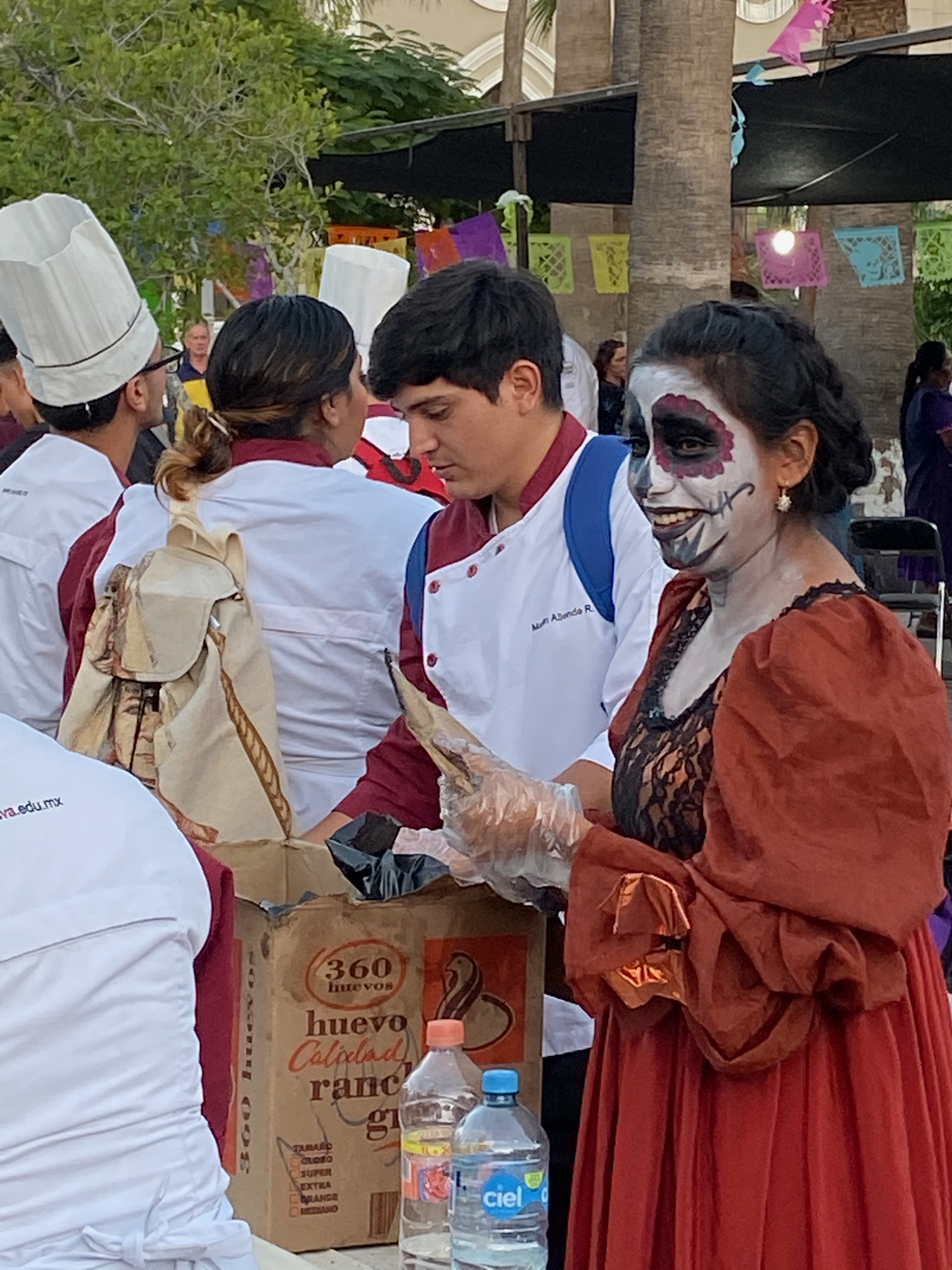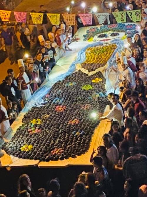 An army of students working on their Bachelor’s of Gastronomy degrees from the local Vizcaya University of the Americas baked for days preparing for their contribution to the festival. They baked and the used pan de muertos, bread of the dead, decorated with colored sugar to create a gigantic Catrina. This elegant, skeleton faced woman symbolizes death in the Mexican culture, sort of like the Grim Reaper. The tiny community was bustling with families enjoying the night.