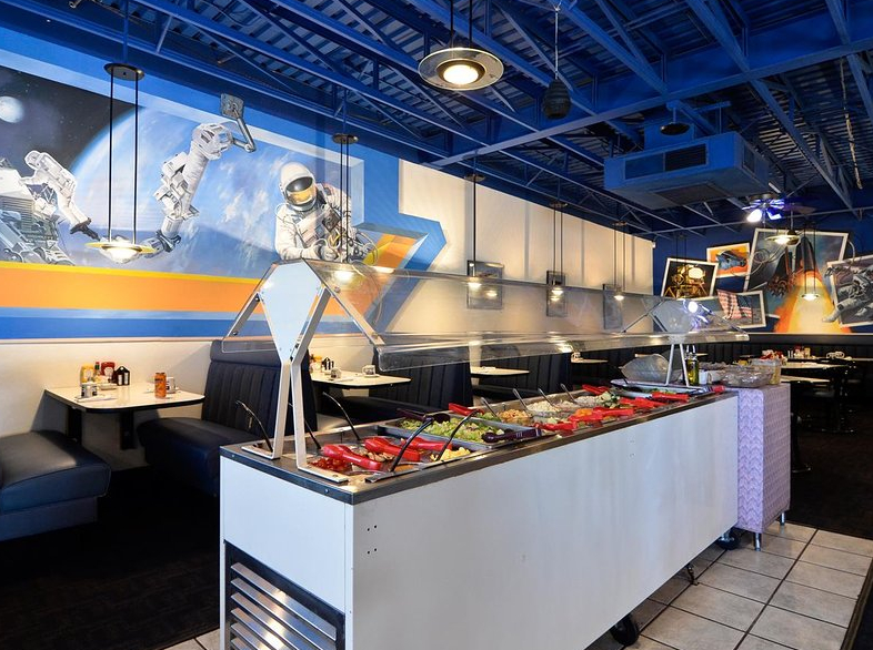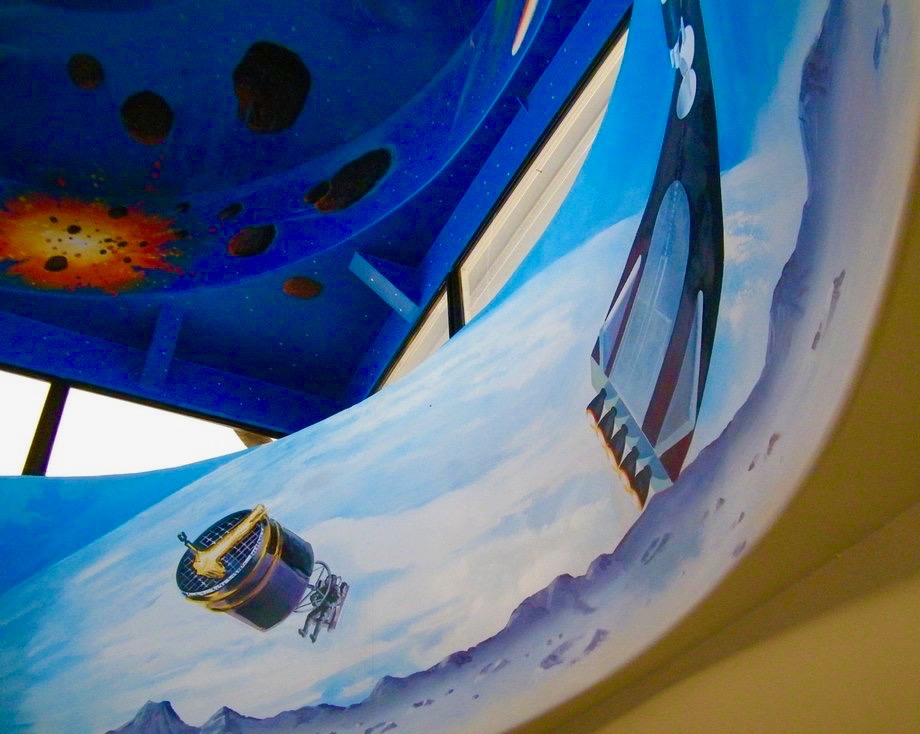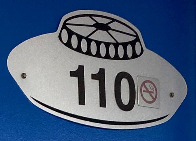 The mission control, registration area is located inside a neon lit, Starship style dome. Once inside a slight tilt of the head upwards reveals a mural of astronauts, constellations, asteroids and planets in the rotunda above. Guests are given a boarding pass, a.k.a. room key, then advised to navigate down the sidewalk toward the bright blue doors. The exterior of the building is painted gray with iridescent glitter embedded in the paint creating a glistening starlight effect. Upon locating the correct chamber, with the help of U.F.O. signage, you find small, clean, plain rooms filled with photos of various USA Space Shuttle and rocket launch missions.