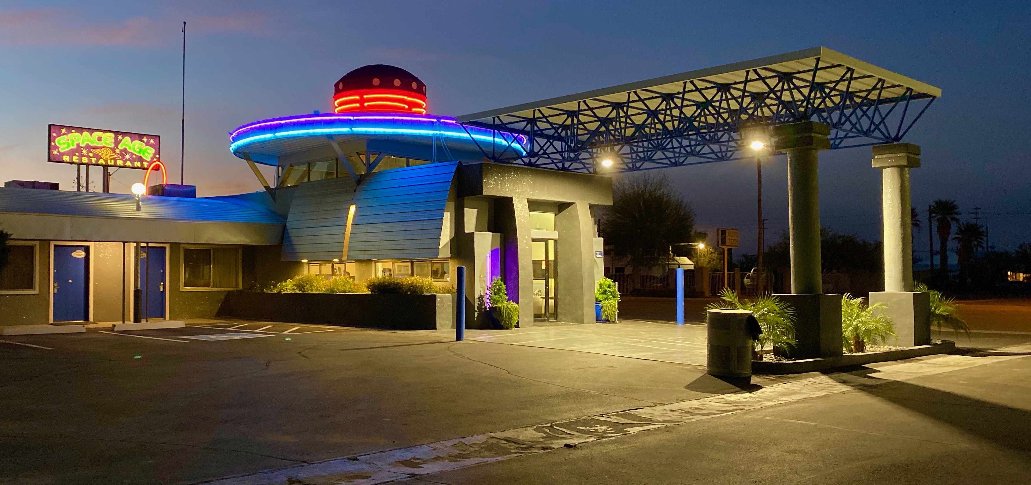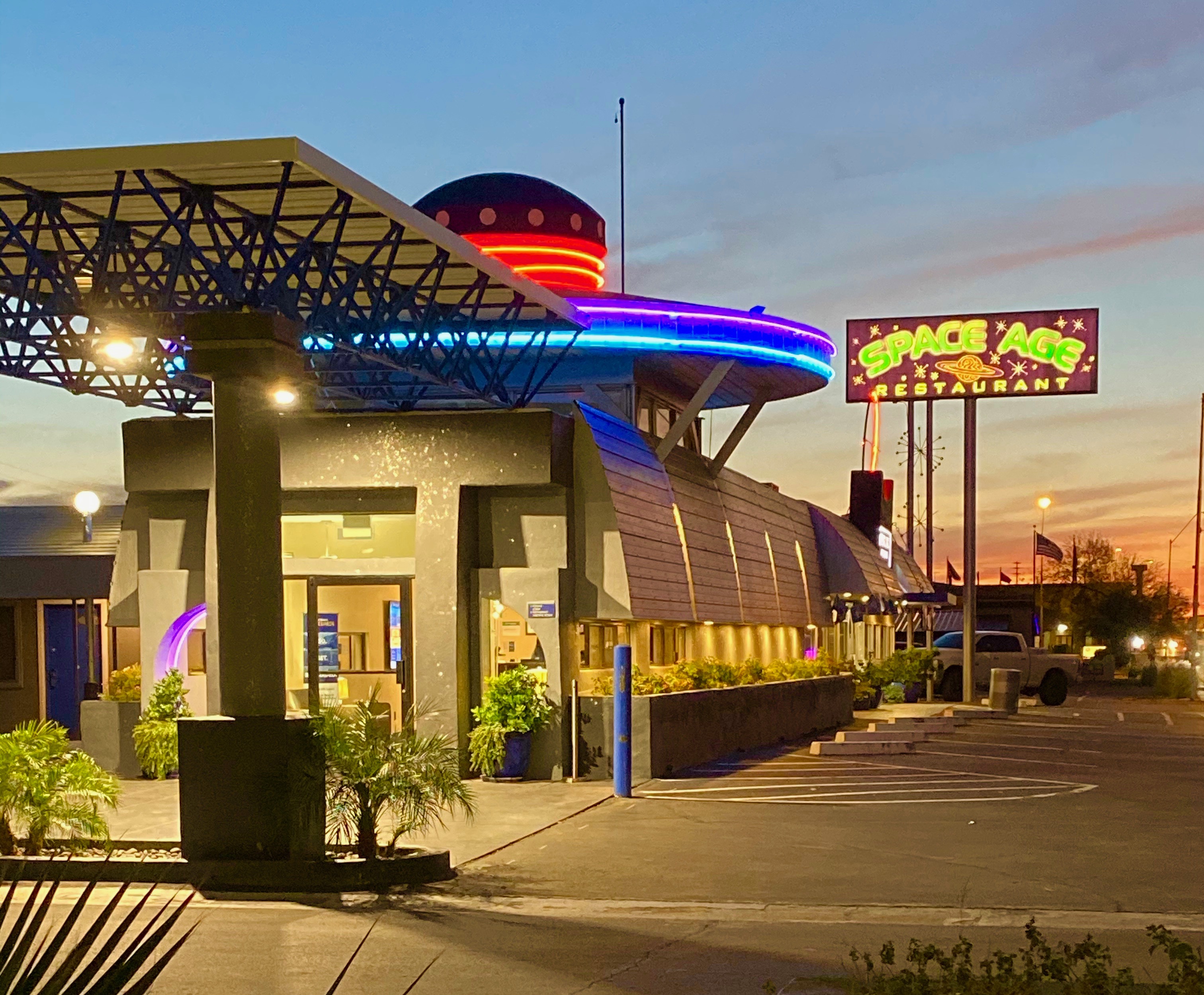 Following our questionable celestial slumber we felt a gravitational pull toward the neighboring Space Age Restaurant. The diner style establishment offers all-day meal service while doubling as the local bar open until the wee hour of 10 pm. We opted for the “Out of This World Breakfast” fare. The service was stellar and the pancakes no doubt added to our individual masses. After filling the black holes in our bellies at the cosmic cafe we were ready to blast off on the reminder of our quest for oddity. While Gila Bend is not a land of little green men, it is a location that can only leave visitors with a glowing aurora.