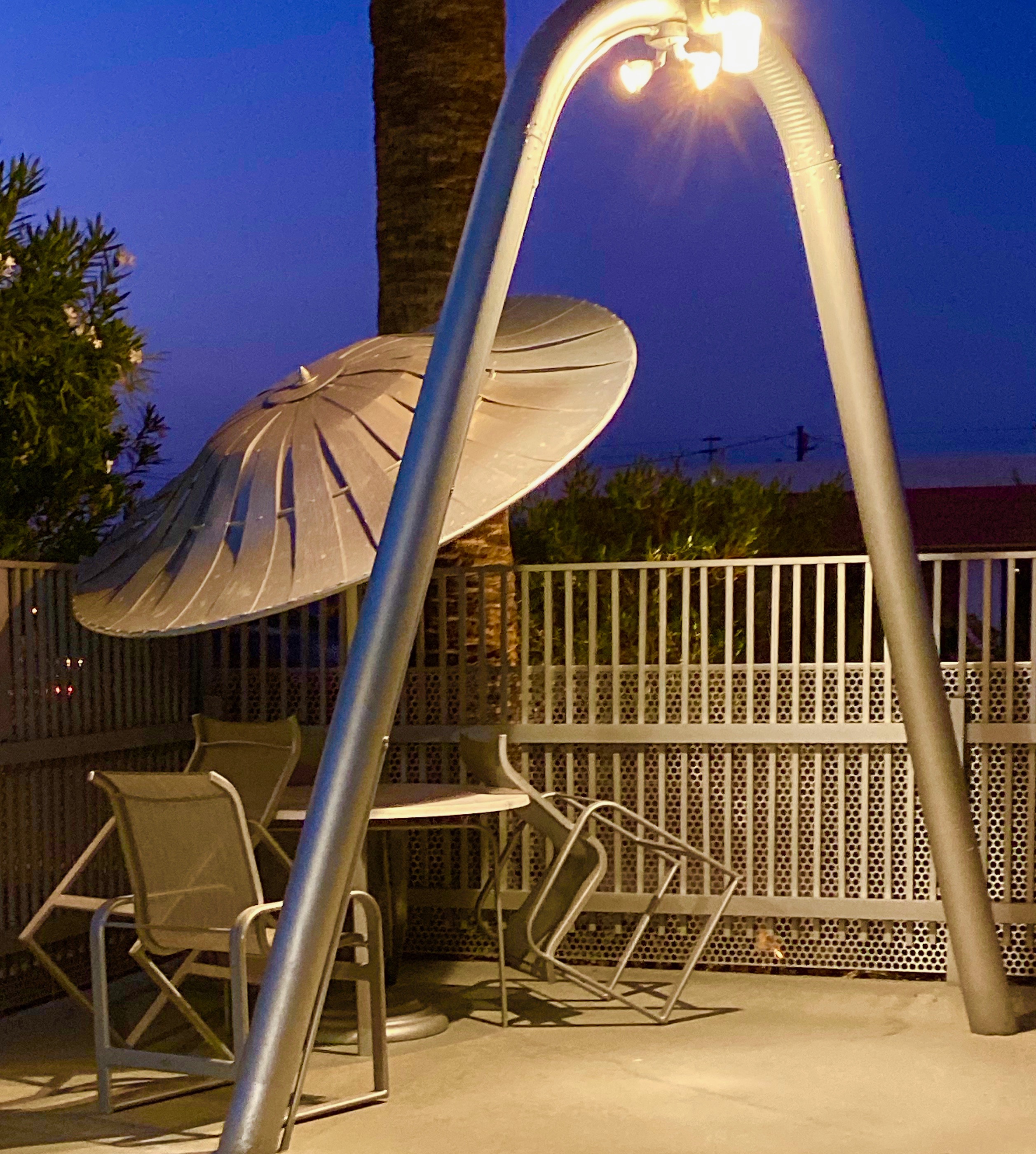 The property is compact so it’s just a short “spacewalk” to the pool area decked out in EVERYTHING silver. While unused due to the time of year this area is decorated with sleek lounge chairs, tubular lighting arches, metal tables and satellite style sunshades. As an added bonus, of course, the nearby hot tub glows an eerie extraterrestrial green. Interestingly, but not surprising, this tiny motel in the middle of the Arizona desert is packed for the night quite possibly with alien beings.