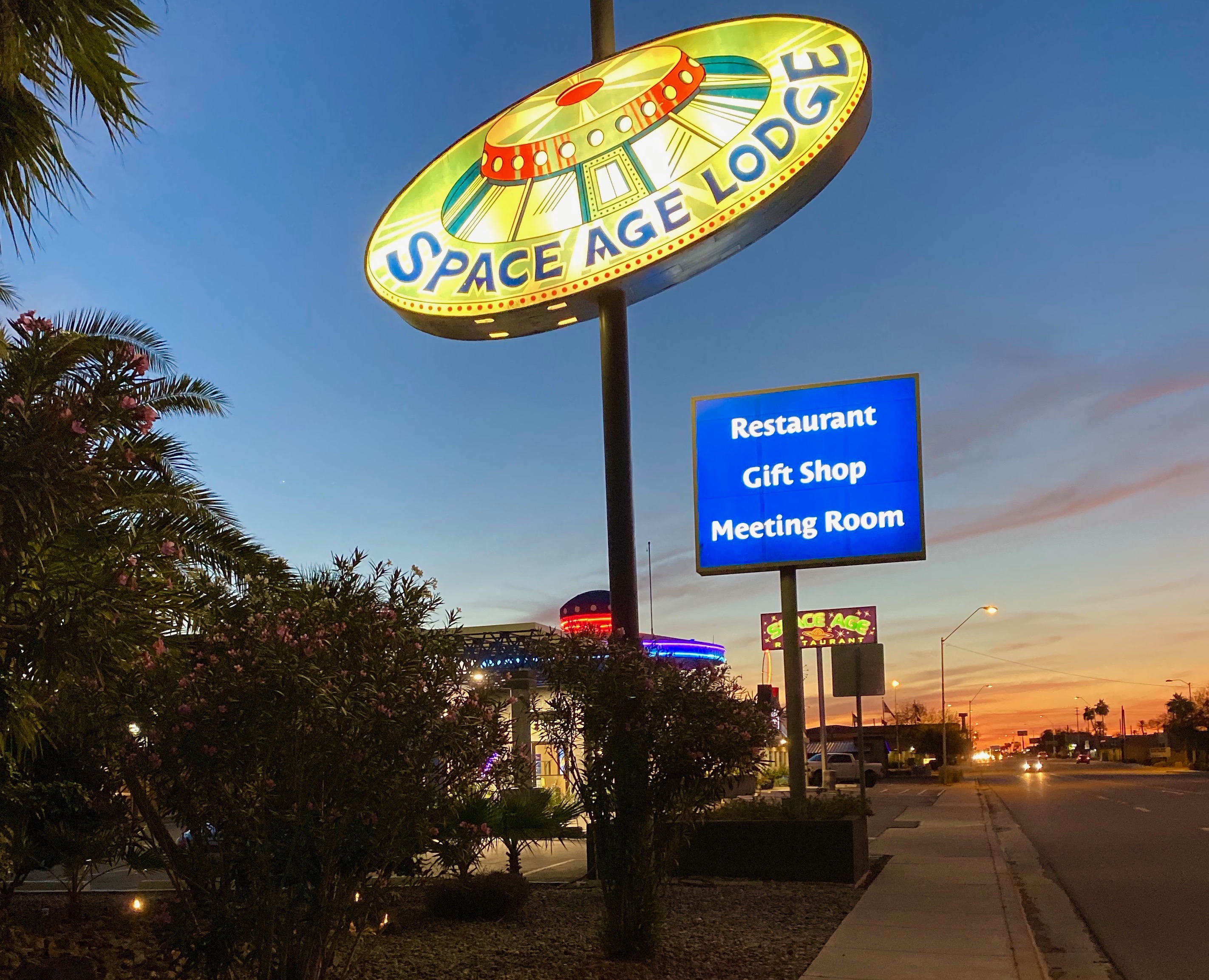 Instead of stopping in the charming coastal towns of Crescent City, Big Sur and Santa Barbara we opted for staying in towns where we could find hotels oozing in oddity. First stop, Gila Bend, Arizona. The giant sign on the outskirts of the little whistle-stop boasts, “Gila Bend a Town of 1917 Friendly People and 5 Old Crabs.” The five bellyachers, Earl, Scott, Clyde, Peggy and Pat are listed by name. In this neck of the desert solar panels outnumber residents and according to Prince Harry, you can find the best pizza in the world. Yes, that Prince Harry. Most importantly however, Gila Bend is home to the Space Age Lodge.