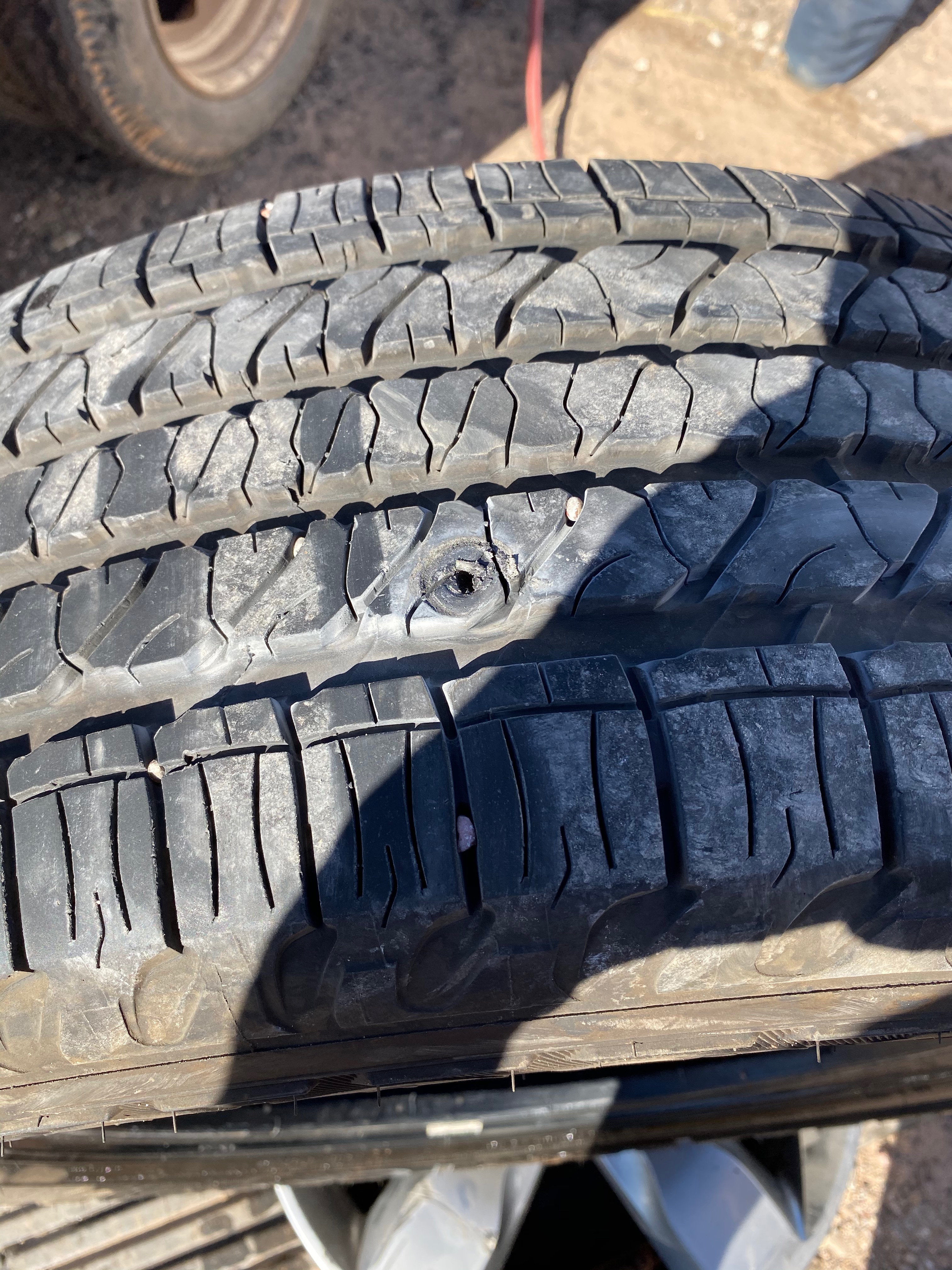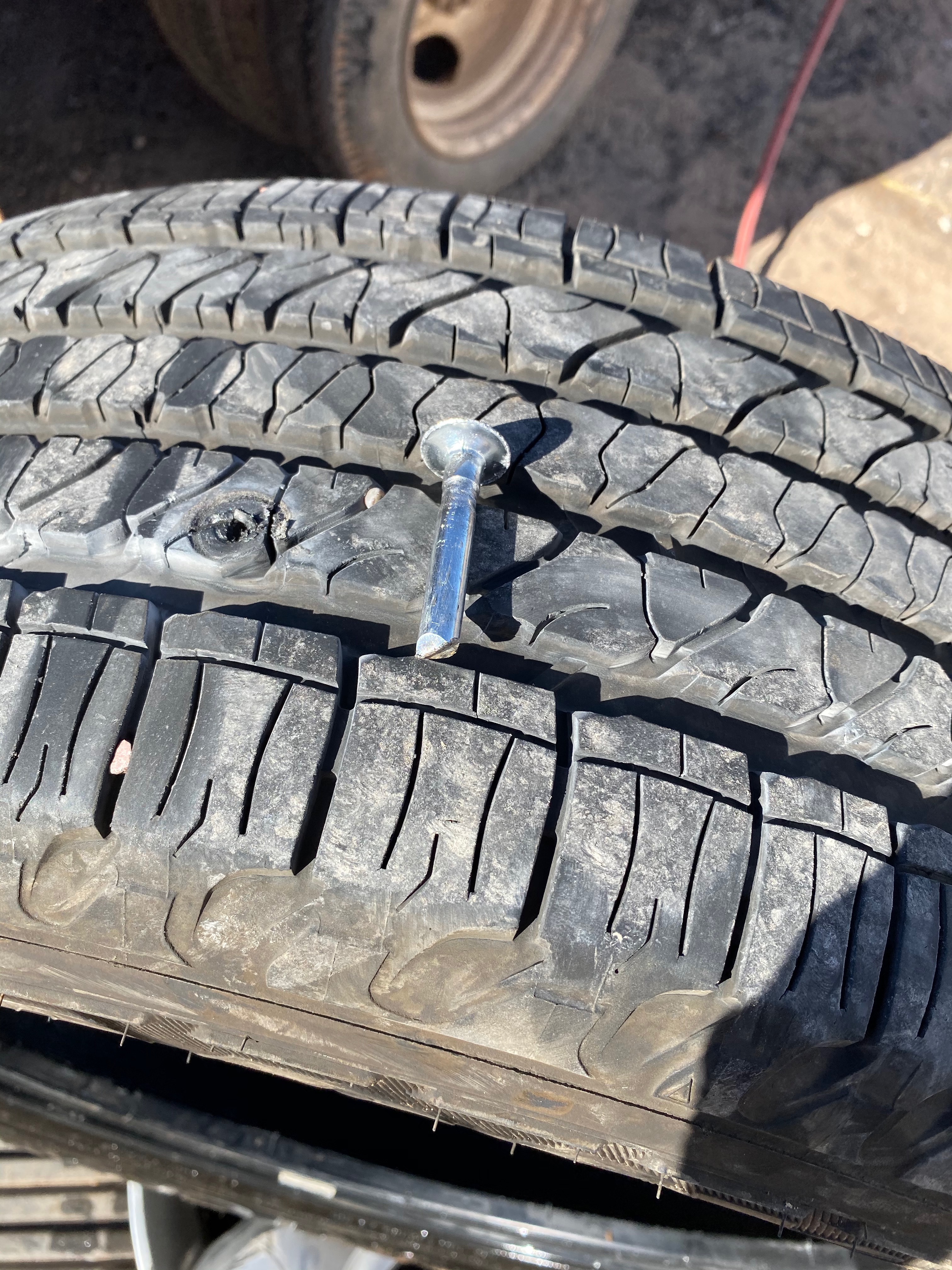 Out of the truck pops a kind gentleman who quickly assessed the situation.  He jacked up the car, removed the tire and found the giant spike that had punctured its way into the road trip.