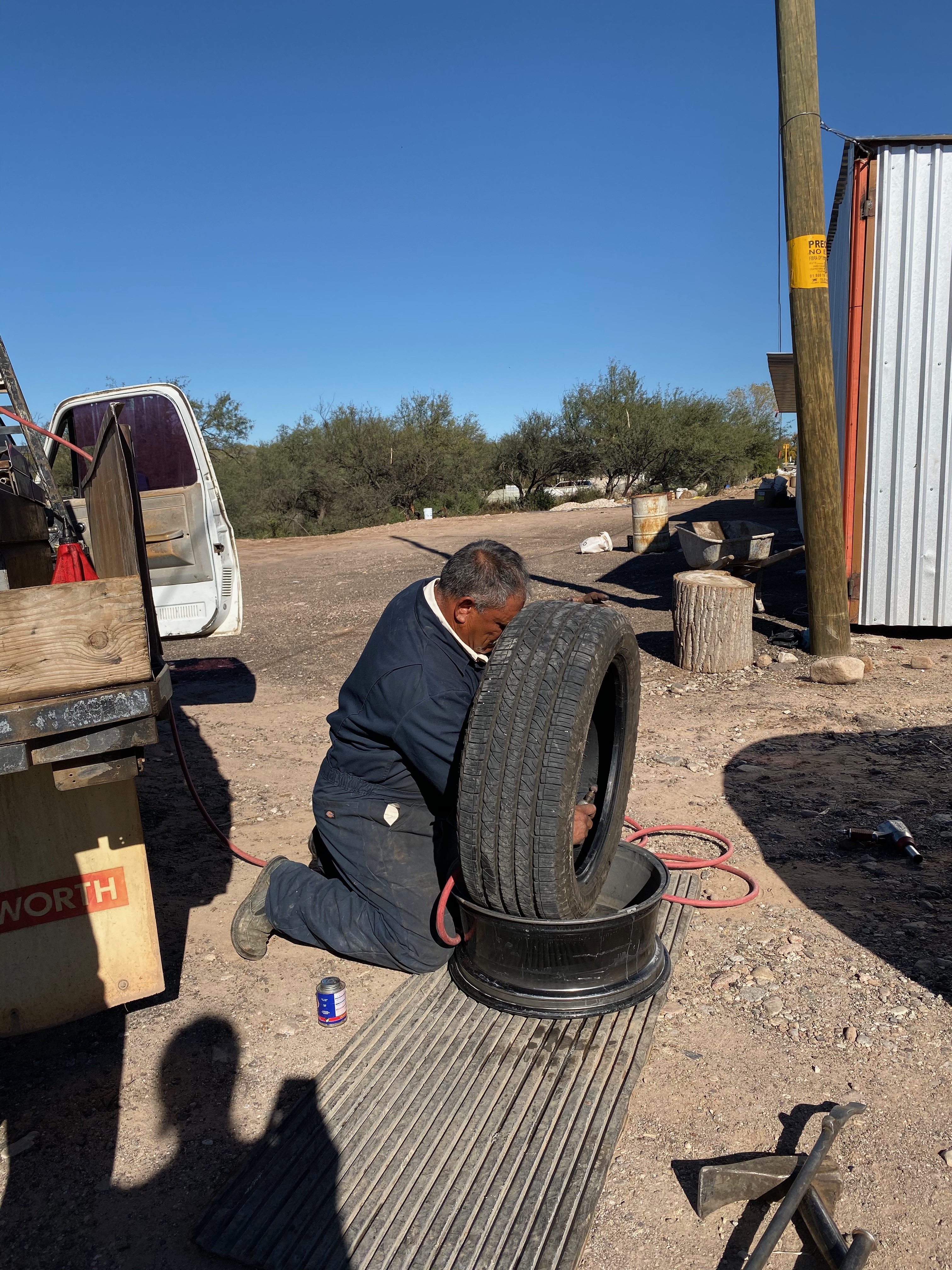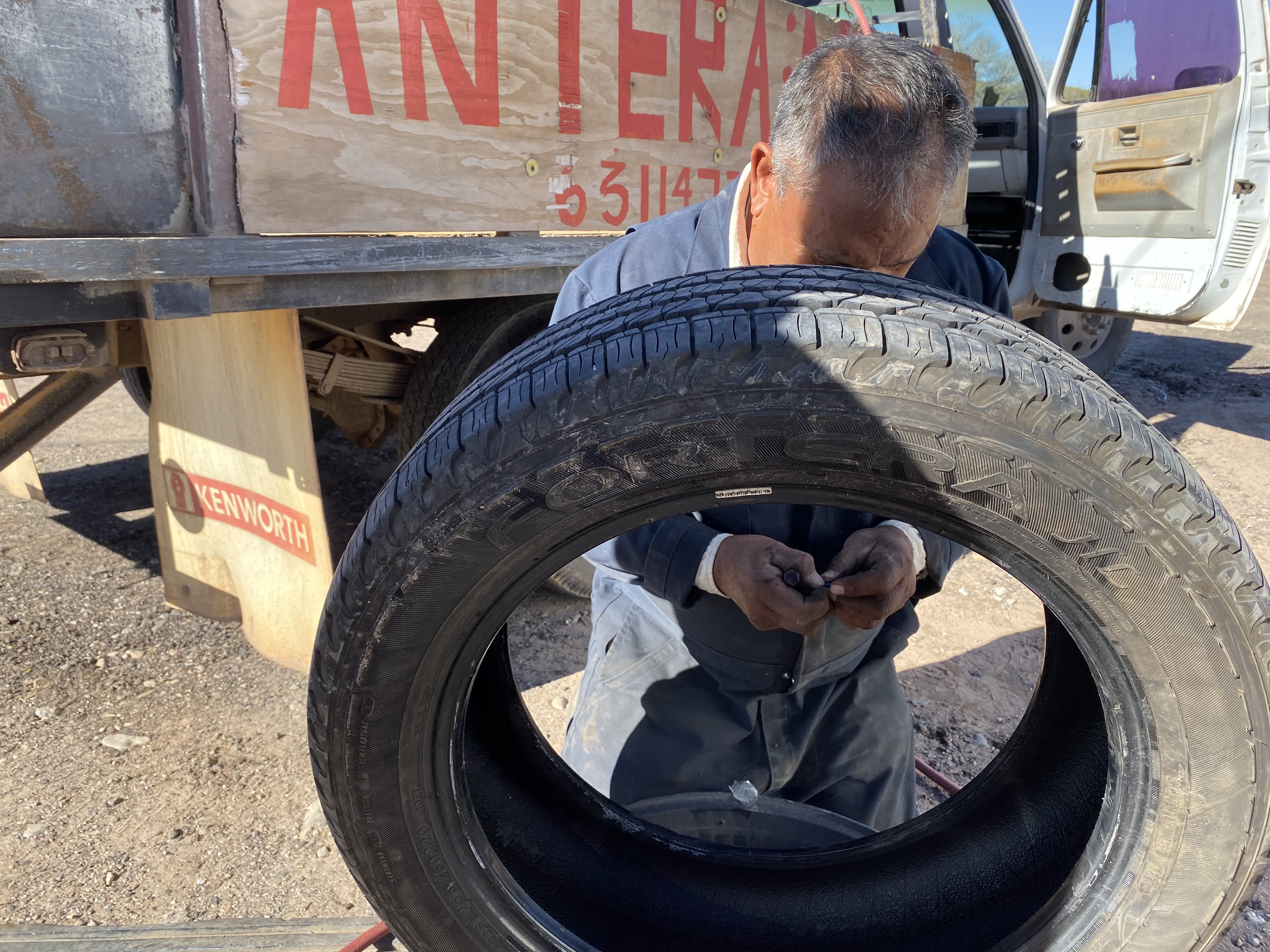 He determined the tire would need to be patched from the inside so this llantera expert used what looked like a combo wedge and giant ax to remove the tire from the rim.  I watched with wide eyed anticipation from the sidelines while Amy bounced across the street to buy the hardworking man a bottle of water. The tire was dismounted, the spike removed and the gentleman proceeded to patch the tire from the inside with glue, heat and a tiny drill like tool.