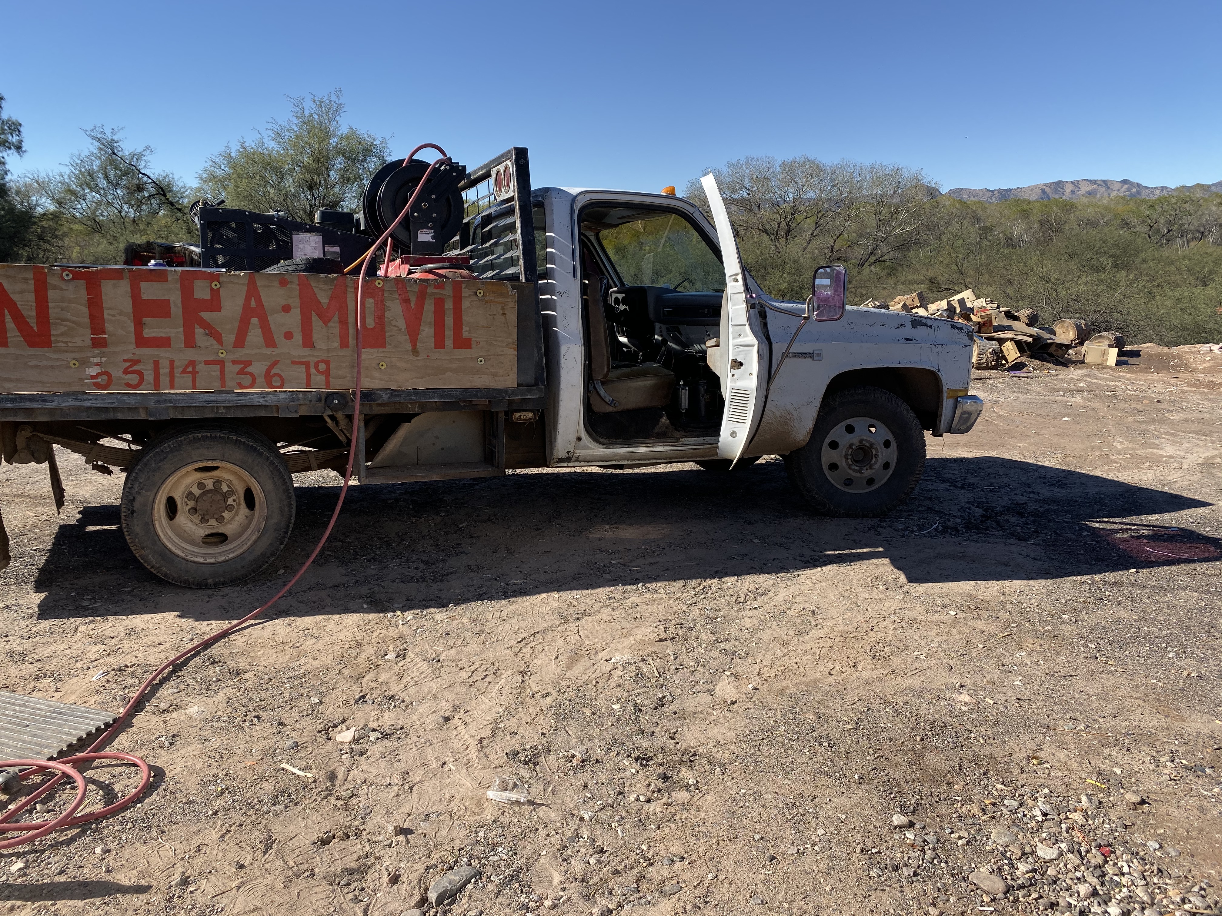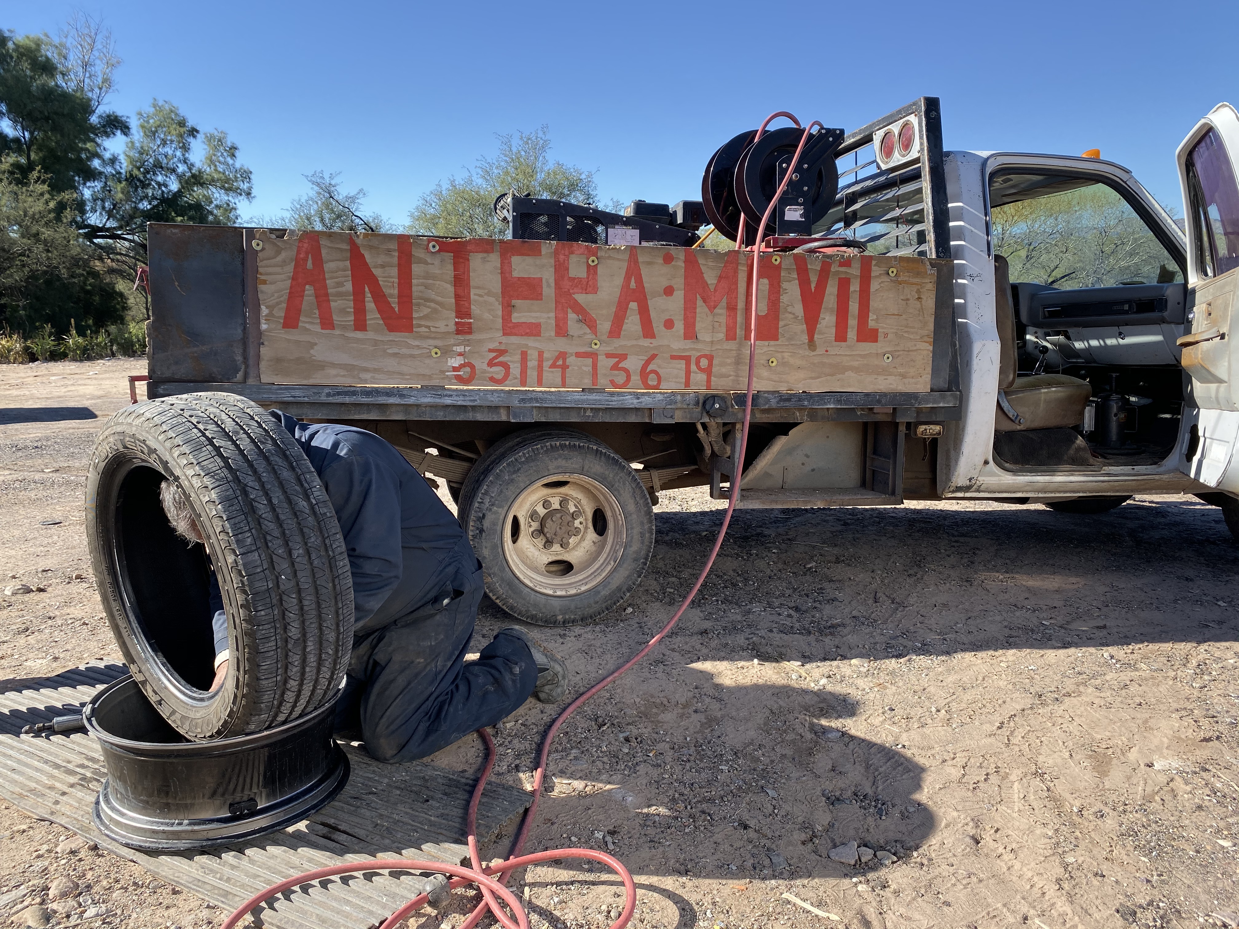 Up pulls an old truck with the words ANTERA MOVIL lettered on the side in red.  Now, llantera móvil means mobile tire in English I can only guess that somewhere along the way this guy lost his L’s.  In the back of the truck there is something that resembles a small Discount Tire garage.