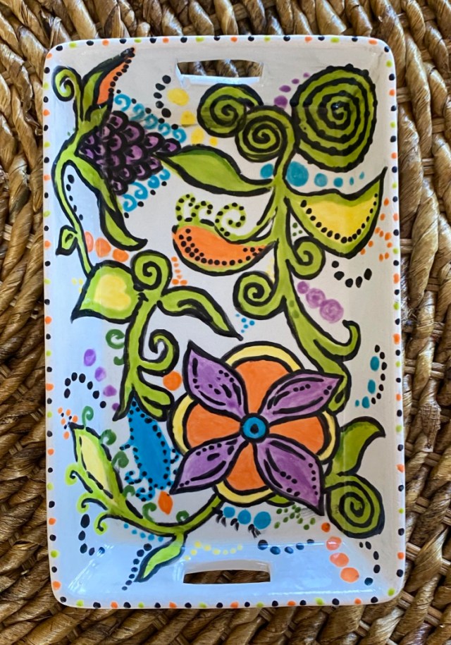 Obviously absent was Patrick Swayze along with any hope of a potter’s wheel. What I did find were kind people willing to step me through the process of selecting pieces of greenware or bisque that could be painted, glazed and fired. With the purchase of an annual membership to cover the cost of paints I could dive right in. So I did. A few hours a week I walked into Club Deportivo, prepared my workspace at a table and painted. Many came to paint alongside me ranging from the sweetest Columbian woman to a couple from Oregon to a new friend from Canada and a college aged brother and sister duo from New Mexico. I discovered many of the painters are snowbirds who have migrated in SC for a few months and spend this time happily chatting with friends they haven’t seen in months. A few weeks in and I finished my first piece. A small tray that was supposed to look a little like Talavera Pottery. Which I suppose it could…in the eye of the beholder.
