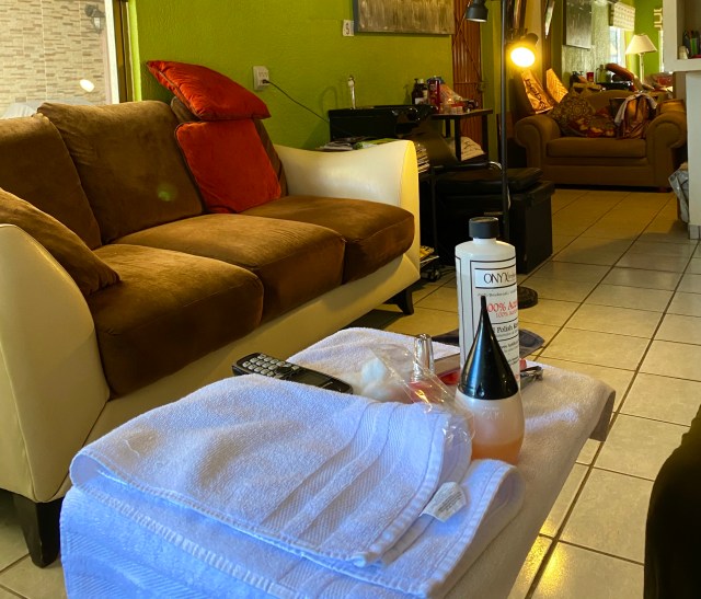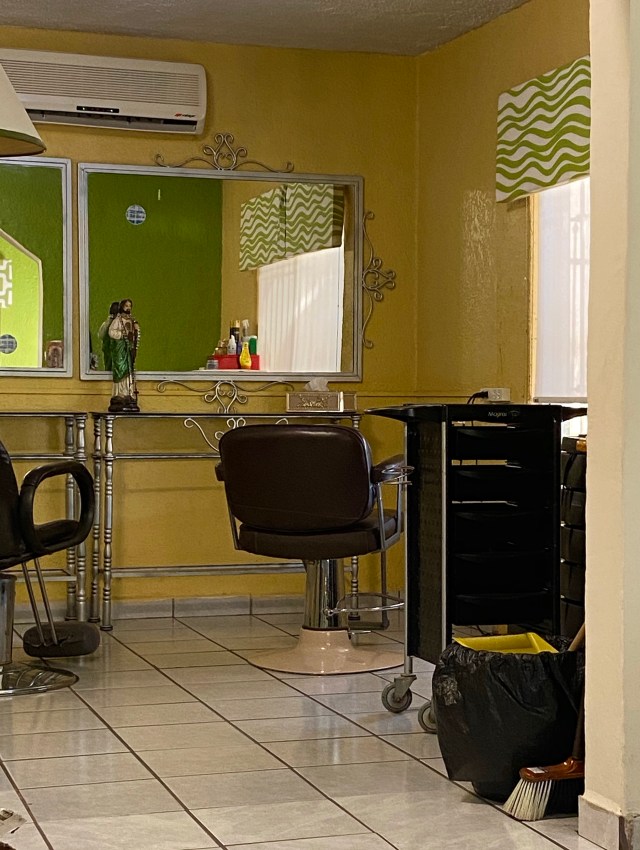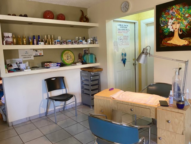 Glancing around I took in the bright green and yellow walls dotted with art created by locals. “Visit San Carlos” mugs adorned the shelves along with products and business cards from local stores. A statue of a Saint stood watch on the glass table near the swivel hair styling chairs. As I absorbed the space Brenda swooped in placing a towel on the floor in front of me. Roxy came next with a vibrating foot bath filled with warm water. This wasn’t the waiting area at all. This comfy brown couch was the pedicure station.