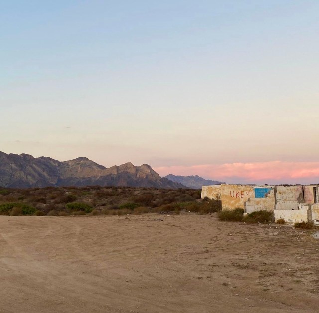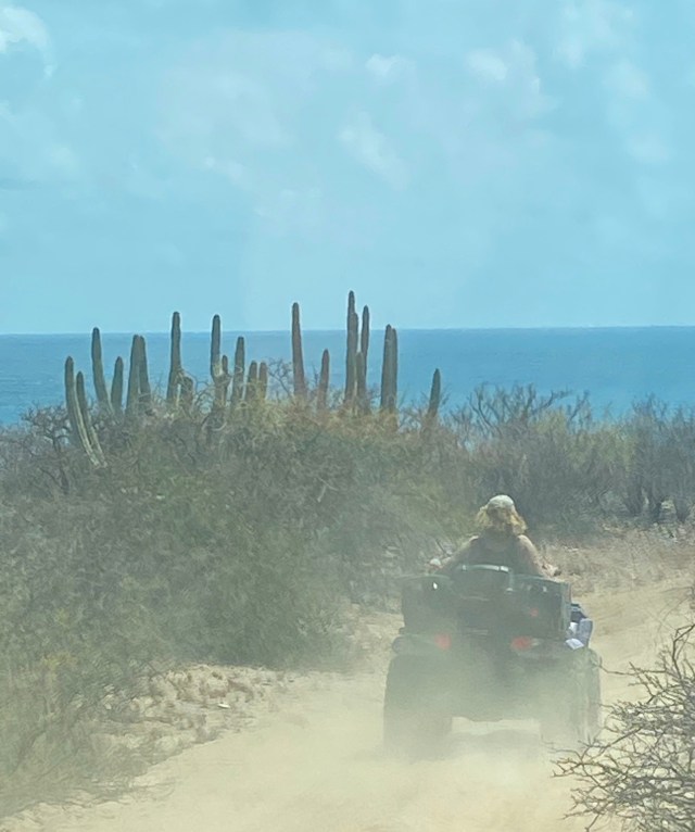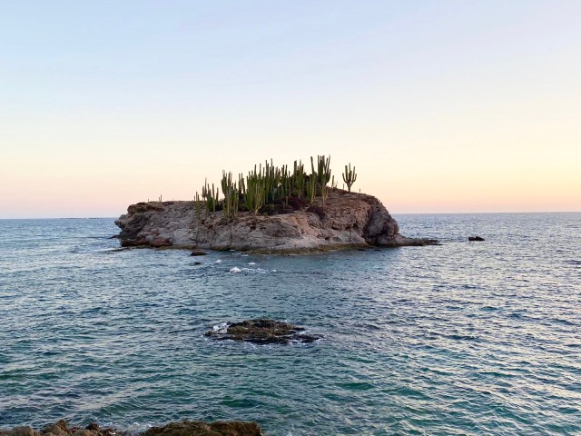 We jumped into the Jeep and shot north out of town until the asphalt ended. We sped through the small fishing village of La Manga where we took a right at a battered orange traffic cone that boldly marks the turn to La Manga 2, an even more remote fishing village.  We maneuvered through the desert viewing cacti and cows along the way then by passing the even smaller village of La Manga 3.  We bumped down the dirt road to the cattle crossing marking the point of entry to a private ranch.  While we’ve never been stopped entering this property, as we rattled over the cattle guard I hoped this was not the day the owner was on the lookout for trespassers.  We zigzagged toward the mountains only to do a 180 to face the Sea of Cortez.  On the horizon we could see the rocky Cactus Island and the soft sandy shore and rolling waves of the water…there are worse places to be stuck.