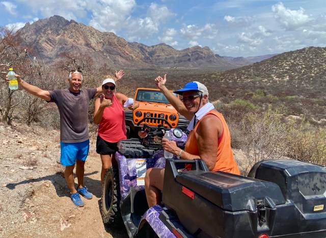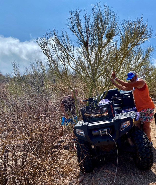 Playing it off lightly Amy claimed she and a friend, Paula, had been riding an ATV and had managed to get stuck.  Unable to drop a pin due to lack of signal, she quickly provided directions to their location.  “We’re a little past Cactus Island just beyond La Manga 3.  There’s a trail to the right before you get to the parking lot. That’s where we took the trail off to the right then made another right and a left.  We are on the side of a hill near a barbed wire fence.” My brain ticks for a few seconds as I realize generally where they are which happens to be in the middle of the desert.  “Oh, and it would be great if you could bring something to cut down a tree because we are wedged up against one and we ran over the ATV’s winch.”  For the record, that parking lot she referred to is a flat piece of dirt overlooking the shore.  Those rights and a left are in the middle of nowhere.  Then she added, “And if it’s not too much trouble, can you bring some water?”
