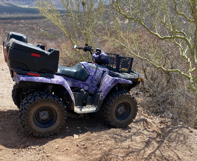 The vehicle was stuck in the sand on the edge of the hill and wedged against a small, mesquite tree.  A branch of the tree had managed to wind its way into the side of the ATV.  Moving it any direction could cause severe damage. Since the tree was literally holding the ATV on the hill sawing it down would create an even larger problem.