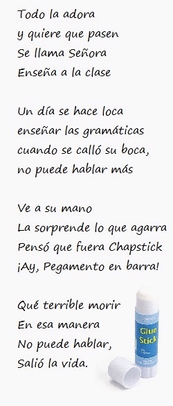 This poem was an ode to an English teacher who loved grammar. She sadly met her demise by mistaking her Chapstick for a glue stick closing her mouth forever.