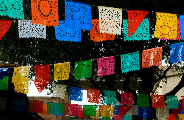 During this time brightly colored intricate cut paper banners, papel picado, often including skeleton or skull images wave overhead in streets and public areas.  Flowers fill shop windows and noise makers, festive music and parades enhance the setting.  It is common to run into men, women and children with elaborately painted skull faces dressed in finery on their way to family celebrations.