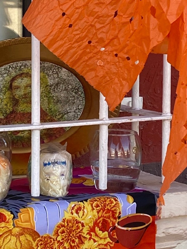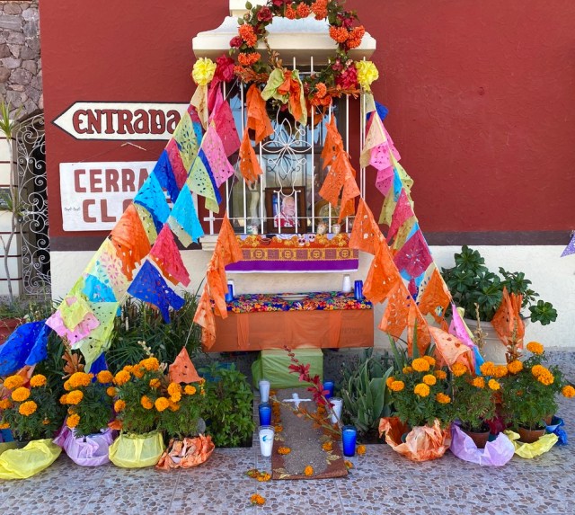 Altars, oferendas, are constructed to house items meant to welcome the spiritual return of those who have passed.  What is placed on the altar varies by regional areas of Mexico and are as individual as the people for whom they are assembled.  Families arrange altars in their home or at the cemetery where their loved ones were laid to rest.  Altars are also found throughout town in restaurants, shops and even grocery stores.  These very personal shrines are meant to create a union between the worlds of the living and the dead.