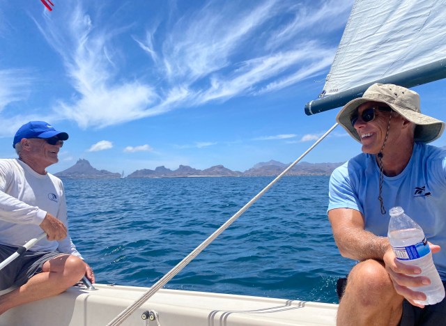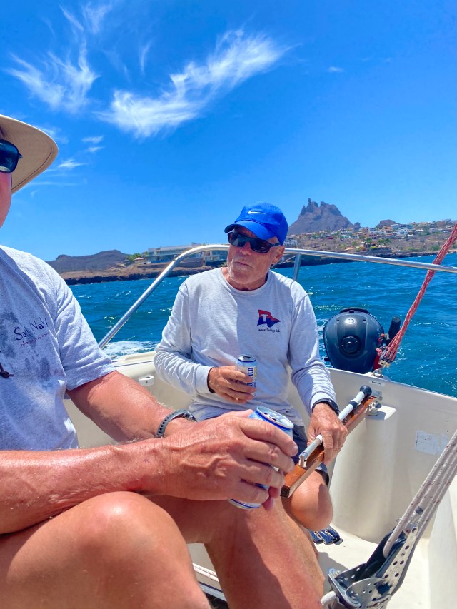 Day one the winds were light and for some reason our newly formed Poco Loco crew missed the start horn. By the time we realized it, we were at least a minute behind the competition. This was when I grasped the true degree of Art’s competitive side. In no time flat he had managed to captain us past other boats and into a top three position. We navigated around the first buoy and whirled past the edge of Window Rock. It was there the winds collapsed but Art hustled to the bow of the boat and made the sail physically larger holding the jib sheet out with the span of his arms. It worked. With the light winds easing us along we took a two minute break to shovel in sandwiches prepared at Barracuda Bob’s and wash them down with Topo Chico.