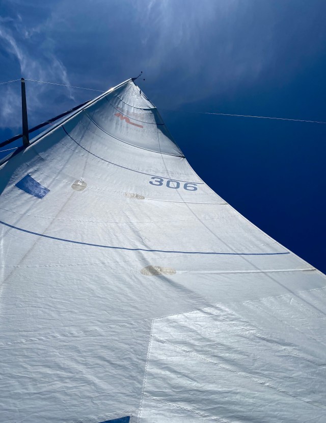 Once out of the marina, the motor was turned off, the mainsail was hoisted and we were officially under sail. For those not familiar with sailing, the mainsail is the largest sail on the boat. It’s hooked to both the mast, the vertical pole, and the boom which runs parallel to the boat and moves from side to side to help capture the wind from the desired direction. A boat can be sailed with just the mainsail; however if you want to increase speed, as in a race, more sail is needed.